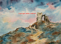 The second landscape is inspired by Lucy Felthouse’s infatuation and current obsession with Mow Cop in Cheshire. After seeing the photo of her latest visit, on her blog, I knew I wanted to paint it, as it looks so dramatically Gothic perched up on the hilly crag. Very reminicent of Jane Eyre and Rochester, wind swept moors and forlorn love! So I decided to let the sky speak for itself, and started the painting by wetting the paper and swirling the paint on with a large brush and seeing how the paint moved on the paper, the fluid shapes giving the basis of the moody sky and mystical clouds. When it had dried, I added to the cloud shapes, and put more colour in to hint at forbidding dark clouds and distant storms forming. After creating the sky (that sounds very biblical!), and making sure it was properly dry, I painted the heather covered rocks and crags, again letting the paint create the basic shapes on its own, and adding detail in the form of splattered paint, to hint at foliage and lichens. The final part was the dramatic architecture, lit by a bright unseen sun -very simply created by basic light and dark shapes to form the stonework, and because they are painted in such a sharp contrast they easily make the painting dramatic and interesting. I used alizarin crimson for the pinks in the sky, mixed with antwerp blue for the forbidding clouds and then burnt sienna and raw sienna for the ground, mixed with the same blue, giving a feeling of unity to the painting. Burnt seinna and antwerp blue made the deep darks of the stonework. I’ll know if its any good by Lucys reaction………