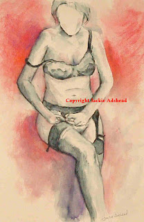 After various conversations this week regarding stockings and suspenders, I thought it might be a nice idea to do an erotic drawing of some! I’m half happy with the image…. for me it needs more dramatic darks in it to give the lost and found edges that I love in a drawing, which make the image settle more into the background. But this was just an exercise in an erotic drawing more than anything else. I did it with a water soluble black pen and neocolor water soluble wax pastels, which entailed putting the pen and pastels dry onto the paper, then using clear water brushed over them to mix the colours and add shading where necessary. I think I might to it again at some point, perhaps in dry pastel on black paper, creating the mid-tones and high- lights or maybe even on scarlet paper putting in the darks and lights with conte pencil. I’ve called the drawing “dressed to thrill” and its up to the viewer to decide whether she’s dressing in anticipation of going out to meet a lover, or undressing in front of the lover……