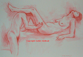 grip on her upper thigh. Since this was more of a feminine pose, I decided to use a scarlet colour and again I got enough depth of tone from the inks to give me enough detail. The female model loved this pose and kept grinning at me, as I drew her. She was getting her own back from the first pose I put her in!!! This image I’ve entitled “Rapture”!