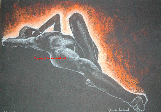 I thought it might be a nice idea to do a series of drawings based on the colours emanating from a woman before, during and after an orgasm. So here they are, in the order they should be viewed. The first is called “Allure” and the woman lies provocatively, her left hand idly fingering her nipple, as her right hand wanders down to her crutch and starts to play with herself. She’s giving off a scarlet glow, as the lust and passions rise, her mouth slightly open, as her eyes stare into the distance as her fantasies start to take form….