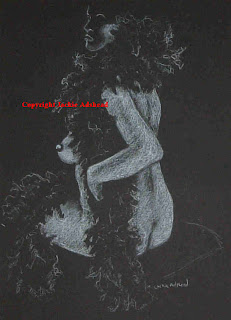 Whilst thinking of ideas for ways of doing the sexy picture of Cherrie cavorting in her boa I thought it would make a nicely erotic picture to draw a woman wearing a black feather boa, on a black background, but only capturing the white of her skin through the feathers. I also wanted the solid female flesh as a nice contrast for the softness of the feathers, just picking out the profile of her breast, the curve of her back falling down to her buttocks, a hint of thigh, her arm bent to add to the tightness of the composition. So having done it, I think it works well enough as an image. I love doing these white on black drawings, just picking out the details of light against the pure black of the paper. Not every part of her body needs to be drawn or every feather in the boa for the viewer to understand the picture. Good job – it would be a nightmare to depict every feather in a boa! The picture is called “froth of feathers” although I think the model would call it “spitting feathers” as she said wearing it, was like being attacked by a hundred chickens!!