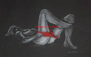 But I can see what he means when I look at my latest drawing (done a couple of days before his comments, incidentally). I wanted to do a sexy image of a woman inviting a lover to join her. I particularly liked the idea of just a hint of interesting and intriguing bright red on an otherwise black and white image, it makes the image far sexier! The white high-lighting the skin of the woman’s thighs and buttocks, as the rest of her body fades into the black background. She languidly lies back looking at the viewer, her smile an invitation to join her, as she gently raises a leg and pulls off her red panties. I loved doing the drawing, and needless to say it’s called “Invitation”!!
