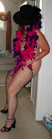 The minute I saw the photo of Cherrie half-naked, draped in her pink and purple feather boa and fishnets, I knew I wanted to draw it. Such a sexy image, I found it very inspirational for an erotic artist – I just hadn’t envisioned how difficult I would find it to do! I started off full of artistic momentum, secure within myself of my own talent, capabilities and abilities, and decided to do the picture as a watercolour painting with a bit of drawing perhaps for the detail. So that’s what I did. …….And ….came up against a mental brick wall!! How can the picture look so stilted? How come there’s no life to it? Mmmmmmm…. do it again, perhaps as a pastel on black paper, hence I’d get instant colour and the fact it would be on black would make the image more vibrant and colourful and sexy. So that’s what I did for my second attempt. And………. that was wrong too!!! How can it be ? Mmmmmm….. more thinking….. and a couple of days later tried it again using the inktense pencils that I love, instant colour, instant washes, tiny details where needed, and big colour washes elsewhere. Third time lucky, surely? Nope, that didn’t work either! What on earth was I missing??? Think. Think……… Racking my brains! Then it dawned on me! What I was trying to do was copy the photo of Cherrie, and whilst it was a clear photo with enough detail, and showed me exactly what I needed to see to produce a painting, what it was capturing was a MOMENT in time. A split second, freezing Cherrie in her movements, into ONE set image. And that wasn’t at all what the thing was about. Not for me. It was about her dancing, her movements, her sexuality, her provocative hip movements, her smile, the way she dipped her head, the way she moved her hands sensuously up her body, the way the boa twitched and writhed, and blurred into movement as it was twirled around her body. That was what I wanted to paint – the whole build-up to that very moment, when the camera caught the image. So, I started again, and that was what I painted! And here it is – in watercolour, with the paint splattered on, to show her dancing, grooving, gyrating, provoking and showing her innate sexuality, her appeal and allure, her desirability and sensuality. Hiding her face under a hat, thrusting her hips out, revelling in the sensation of fishnet hold-ups and her sexy high heels, the feather boa a lovely accompaniment to her erotic dance, hiding her skin, flashing part of her left breast and a nipple. Dancing to her sexual beat. Sooo………….. How did I do?