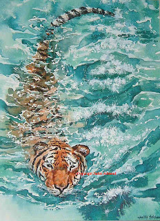 I have painted lots of watercolour paintings of tigers. I love tigers. I love their bright dramatic colouring, their stripes, their menace, and the whole cat thing about them. So the first tiger painting I did was quite naturally called “Burning Bright”. The next one I did was called “Tiger bright” then followed “Spitting mad” since the tiger was all teeth and fury. After that followed “The tiger within” since the tiger looked like it was looking though a wall of water at the viewer. Then came “Cool regard” as the tiger was looking quietly at the viewer, and then came the jokey one which I called “Tiger spotted” since there were two tigers in the painting, one all regal and majestic in the foreground, and the other was approaching from a distance, having spotted him, and it amused me to call it that, as tigers aren’t spotted, they’re striped (as well you know). So, all tiger paintings, all with titles I was happy with. Then came the painting I did of a tiger swimming. I was really pleased with the painting, it had gone beautifully, looked good, and was technically well done, showing the body of the tiger submerged beneath the green waters. But what to call it? I went though all the titles I could think of ……. tiger swimming, tiger in water, water tiger, swimming tiger…… none of them worked………. so in the end I called it “Sea for cat” being a pun on the phrase “C for cat” and it amused me to call it that. But I had chickened out of the title I SHOULD have gone for………..it was so obvious, so deliciously apt, so totally RIGHT, and yet I didn’t use it!! So, now you’re wondering what it is, what I should have called this painting of a swimming tiger?