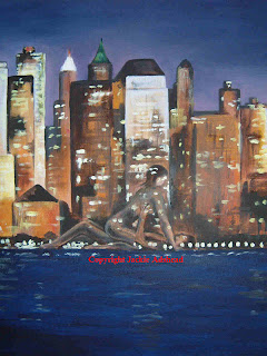 The painting is called “Towering passions” as I wanted in some way to incorporate the lights of where the twin towers once stood, as a hint of the title, and perhaps take away from the erotic couple a bit – a sort of play on words. And here’s the detail of the erotic couple so you can see them clearly and how they look. They’re nicely hidden in the main picture but clear enough if you know where to look. The fact they’re muted has helped to hide them, and putting the lights over them has also helped to disguise them within the image. I’ve loved doing this painting as I love hiding images within images.