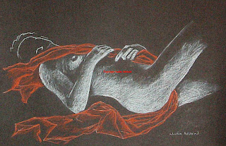 Well……. Christmas is over. I find it an artificial time, for various reasons. But now its gone, I can get back what passes for normality in my life! So….. what would that be then? Oh, yes, I remember! ………. Naked women!! And better still, naked erotic women! So, I’ve done a new drawing. Something that is arty and erotic. But the thing I like about this drawing is the title that makes it so. The image is of a naked woman lying on her back, with artistically draped fabric arranged around and along her body. All very tasteful. The fabric is a nice contrast and the fact that its a different colour accentuates that contrast. Even when you see that the fabric is pulled between her slightly open legs. Yes, you think, that’s arty and nice. Then the eye follows the fabric up along her body, and sees that her hands are clasping it quite tightly. And that her head is turned to the viewer, with her mouth slightly open. And you think, yeh, thats ok, its arty. Then you look at the title. And ……………smile. Because the title is “Exquisite friction” and you realise, that there is movement in the drawing. Not that you can see it, but because you can feeeeeeeeeel it. Because of the title…………. you know …..exactly….. what she’s doing!!!!
