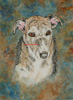 Due to a busy week and other things getting in the way I’ve not been able to do much work on the second dog commission this week and the Christmas deadline’s looming….. And none of this helped by the fact that I’ve had a stinking cold this week and felt like shit!! But, part of the joy of being self employed is that jobs have to be done for deadlines no matter how you feel! So….. today I thought I ought to at least try and get some of the painting done even if it was something easy like a bit of the background, (cos in theory I shouldn’t be able to cock that up, even if I did feel way under par). So, a cup of tea in one hand, and a paintbrush in the other, I stood and looked at the painting and realised virtually straight away that I’d been going wrong in the first place by thinking that I should use gouache paint! I’d chosen it as I needed to paint virtually every hair on a hairy dog, I needed to use a medium that could paint light on dark (unlike watercolours) so had opted for gouache to do the job, but didn’t like the effect I had achieved so far (I couldn’t have been THAT ill then, if I could tell that straight away!), so my only option then was to use acylics as a fast drying watercolour medium that would show the gouache under-painting clearly but give a better overall result. I quickly did a glazing wash over with the acrylics and instantly felt a whole load better about the painting, to the point that within a few hours it was completely finished! Wow! I certainly hadn’t expected to finish it today. And that surprised me too. Because I started painting feeling bunged up, and full of cold and not thinking straight, and ended up still bunged up and full of cold, but with a totally clear head, aware of my creativity working properly and finishing the picture and even being very proud of the end result. So, another Wow!!! Perhaps my well-being just needs to be creative to get me feeling better!!