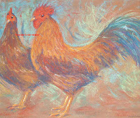 Sweetie, I love the painting of the rooster and hen. I love the bright colors and I especially love how the brush strokes show your talent and style.
