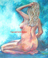 I was asked this week by a friend, who is not artistic, how I knew what to paint the dogs “in”. Interesting question. And one what I can answer instinctively (although perhaps not too much considering that the “instinct” is based on many years experience and lots and lots of practice!). The dogs were painted in acrylic dry on dry (dry paint on a dry paper) as I had to pick up all the little nuances of colour and tone, and give the illusion of hair and fur. Its not a technique that I normally use but its just perfect for animal fur. Having said that I’ve painted a lot of tigers in watercolour using the wet on wet technique (wetting the paper first and pouring the paint on). That technique is lovely for creating swirling shapes and movement, and I use it a lot for the tango paintings too as it gives the illusion of movement, perfect for dancers. And I’m pretty sure when I do the illustrations for the unicorn book I shall use bright watercolours for the lovely mystical colours and shapes that add interest to fantasy paintings. And I adore using oils, although they take a lot longer, as the buttery texture merges and blends so well and the colours just flow, even though painted a different and controlled dry way they can be painted just as dots of bright colour on a contrasting colour well too. And I sometimes draw with pencil, giving lovely tonal depth to a monochrome drawing where colour can be superfluous to the overall effect. And then I sometimes use pastel or chalk to create chunks of colour in a figure drawing, utilising a fine point of the same colour for the details where they are needed. And when I want to be finely detailed in a picture of buildings, pen and ink is perfect for it. And then there’s the joy of using mixed media, and just using whatever is at hand to make interesting textures and create movement and vibrancy in a painting (and usually getting very messy in the process, what joy!!). So, some subjects lend themselves to certain mediums. So, that’s how I knew what to paint the dogs in – acrylics. Of course, if someone wanted a particular piece of artwork painted in oils instead of watercolour, or acrylics instead of pastel, then that’s what I’d do. Its not that difficult to use something else, and it will certainly give a different effect by using differing mediums. And that’s why I’m interested in the effect I’m getting painting over the acrylic painting I did three years ago, but in oils now. The tones are far more subtle for flesh and skin and the painting is so much better for the change. I’m working on the faffy bits now – the tiny details that make or break a painting. The toes, the colour under the arm, the sharpness of focus around the nipple, and particularly the hair. I want the hair to be soft and flowing, the sort y