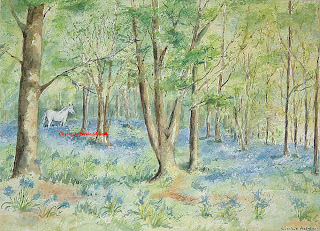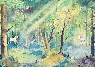 Early last year I painted a watercolour of a white horse in a bluebell wood, and although it was exhibited a couple of times locally, I didn’t sell the painting. And looking at it now I’m not at all surprised! Its a very mediocre painting, of a mediocre subject with no depth of tone to it and nothing exciting happening within the painting. So, when I cast my eye on it last week, after looking through my dusty file of old paintings (filed under “not good enough to frame and too good to throw away”) it struck me straight away what I wanted to do to it to change it. Wow. Instant idea! So, I did a little pencil thumbnail sketch , showing where the strong tones were going to be, and where I was adding the interest and got on with the painting of it. And d’you know what???? ……..I think its one of the best paintings I’ve ever done! I’m mesmerised with the result! I can’t believe how MUCH better it is from the original. Its astounded and totally amazed me! And it was me who painted it!! But just incase I was getting too carried away, and to get a second opinion, I showed it to my spiritual healer friend, since the subject matter is now two unicorns and not a single horse as before, and unicorns is very much her subject (as she’s writing a book on the subject