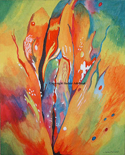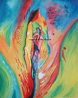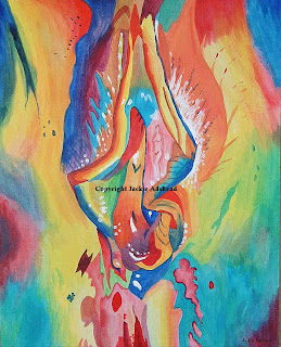 Just to give you the background before I do the grand unveiling, I wrote a year ago (and it is a year, all but one day, now that I’ve checked, Wow!) about wanting to do the paintings as a celebration of womanhood – as bright and colourful abstracts of their most innermost secret places. The thought was that when someone has their portrait painted, its of their face with their name as the title – but in this case I wanted the names to be anonymous – so unless the participants reveal it, I won’t say who they are. I originally asked for volunteers and at the time ten women contacted me, but I only received good enough photos from seven of them – and these are the original seven here. I hope that more women will be interested in having their “Queynte” painted and I would love to see them all part of an exhibition somewhere for the world to see – because just seeing the seven of them together is a beautiful thing already! I hope to sell any to anyone who is interesting in purchasing them – but at this moment I have no idea what price to put on them because I have put so much of MYSELF in them, I don’t know how to put a financial value on it as yet (I will in time, I just need to think a bit about it for a while!). I painted them intuitively – which is a new concept for me – and one I like very much. It was the right way of painting them, as they are so personal, and abstract. The point of the abstraction was so that they, although anatomically correct, are hidden enough in colouring and some of the external shapes to hide the image for what it is. I want them to be hung on a wall so that anyone other than the people who know, would not know what they are – except for something exotic flower shapes maybe, that may just resemble something subconsciously and vaguely erotic…..