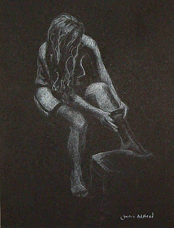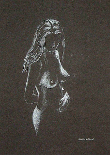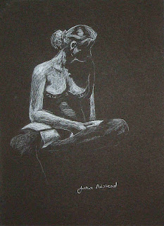 Right – now on to the Art Auction I promised you the other day. We’ll start with three erotic drawings. All of them are white conte pencil on plain black card. They all pick up the light on the models skin whilst leaving the rest of the image in darkness. They are all unmounted and unframed. I think that they would look equally appealing in a pale or silver frame, without a mount, or, if you prefer, a pale cream mount with a black frame would look stylish, or any other frame that fits in with your colour scheme would enhance them.