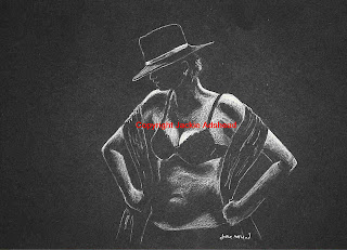 I’ve not shown you a drawing for a while, and thought I’d show you my latest. I love these white on black images and think this one works particularly well. I had decided that I’d draw my usual model in a wide brimmed hat, and she was still wearing her black bra whilst we were deciding on poses. I liked the basis of the pose but felt it needed a bit of something else, and with the addition of a long scarf, this was it!!!! I loved the pose the instant I saw it – lots of lovely strong diagonals, her face in shadow under the wide brim, her hands on her hips in a defiant pose, and lots of white flesh peeping out from under the clothing, with enough black clothing and shadows to add a lot of interest………………The picture works really well and I really do love it! As for the title, I felt that she was thinking about something with her head held down and her hands on her hips and that she had reached a decision regarding it, and this was what lead to the title – “Decision made” – as to whether the decision was to her choice of clothing at that moment in time, or a deeper and more profound problem, that’s for you to decide…………….