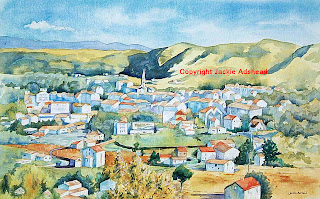 I started with drawing the image out – and placing the “s” and “m” within the shapes of the landscape. Then I used masking fluid to protect the areas that are the white of the buildings. Then I could start to paint, and did a wet wash for the sky in cerulean blue with a touch of cobalt blue to add depth in places, and dabbing out the faded cloud shapes whilst creating the stronger white cloud on the left hand side to add interest as well as balance. Then the distant mountains were painted with cobalt blue, and after they had dried I painted the near hills in green gold, cobalt blue and french ultramarine for the deep shadows, and making a strong contrast for the church spire to stand out against and be the focal point. After that I painted the trees and grassy ares around the town in cobalt blue, cerulean blue, green gold and quinacridone gold. Then it was the darks of the houses in cobalt blue, cerulean blue, egypt violet and french ultramarine, and the red and oranges of the roofs in cadmium red and aurolin. By then all the areas had been painted and it was time to remove the masking fluid revealing the white paper underneath. And after that it was working over the whole of the painting to darken areas around the whites to make them stand out more, and add touches of deep colour to add depth to the painting. I think its taken me a little over 20 hours to create it.