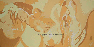 With Erotica coming up in a few weeks time, I wanted to do a painting to exhibit there, depiciting a tarse and a queyte in a sort of “abstract of an abstract” using only a very limited palette which would make a more decorative generic image rather than a specific one. So after I’d found the image of a fanny and a cock that I was happy with (and that’s actually more difficult than you would imagine! Its not easy looking for either, I can tell you!!!!! LOL ). Anyway, after I’d eventually found the images I was happy with, I had to put them together in a design that was pleasing to the eye, but by using only the basic of shapes and tones to get the image across to the viewer. And added to that was whether to put the fanny to the left or the right of the cock. To start with, I thought it would be better if the fanny was on the left of it, but they looked like they weren’t very interested in each other (so to speak!) so the fanny went to the right, but then the image looked a bit more …..er……..erotic than I had planned, but it has to be this way to make them look like they are a pair – a “his and hers” of a painting. Then, once I’d drawn out the design I liked, I transferred it to a box canvas – its quite a large size – 40 x 20 inches plus the sides of the canva itself as I like it when the image goes around the corners of the canvas, it makes it more 3-D I think. I knew I wanted to do the acrylic painting in creams and golds, although I had to have a slightly darker gold to make the depth of the image, and I’ve used white (well, actually very very very pale cream to look like white, otherwise the white looks dirty against the warmer creams). And the finished result? Well its here for you to view and I love it for its clean crisp lines, simplicity of shape and delicate colours. And I’d love to do it as a “hers and hers” or “his and his” painting too – and of course any colours can be used for it, to match exisiting decor. So…..my first “Tarse and Queynte” painting. But one of many, to come, I’m sure (so to speak!!!!).