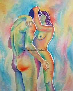 Second version was a lot better. I was happier with the composition after I’d made a few small changes; I was happier with the rainbow of colours and how they interacted, and I was happier with the end result……….. by a long way! So, here it is, in all its vibrant glory. An erotic couple, in love, their colours mingling, the fire from their lust igniting them, their love enveloping them, she pulls him close as he gently runs his finger up her thigh.