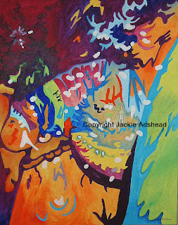 And secondly we have an American cock in full and very strong vibrant colour making Tarse 2. A lot different to Tarse 1 that I painted earlier in the year, but that was for Fitzy and had to match the delicate tones of the living flame painting it is to hang next to. So that gave me full opportunity to depict this tarse in more vivid bright colours. The photo I worked from had good strong lighting in it which gave deep shadows and I was delighed to use those in the painting to trick the eye a little. Because its very difficult to hide the shape of male genitals as they look so very clearly what they are! So as I started painting, I was aware of that and put as many tricks in as I could to hide that fact, and thought I’d done quite well until I’d virtually finished and realised that all looked fine except the left had side of the painting, which made it very clear as to what the painting was. I found that if I blanked off that first fifth of the painting, the rest of it was so abstract as to be anything. Hmmmm……. in that case I’ll incorporate some other shapes to confuse the eye. And that’s what I did. Abstract shapes. That meant nothing. Except now I’ve done them, every time I look at them they remind me of something very particular. Perhaps its the way my mind works. Perhaps you can’t see it. But I shall be interested to see if you do! And instead of taking them out, I shall leave them, as it makes me smile every time I look at them……….. And I love that I can always see other shapes within these paintings – various letters of the alphabet, a bird, and shapes that remind me of elephants, fire, dogs, deep space, and witches…….