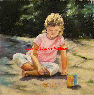 And that was how I found myself at the art workshop at the weekend, drawing a pretty little girl in a pretty pink tee shirt, and pristine white trousers, sitting on a sun lit patio, with dappled summer shadow behind her, playing with some chalks. Now, that’s cute by anybodys standards!!! LOL