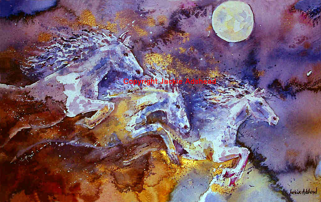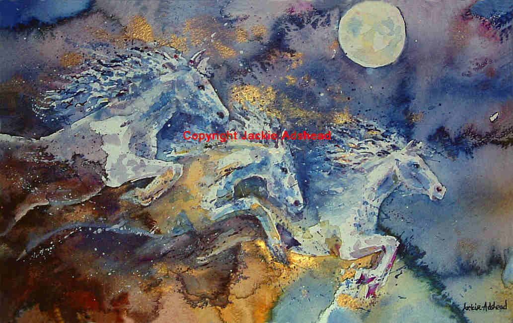 The original painting has some nice blues, and purples, greens, and deeper shades of burnt sienna and red in it. I’ve always liked this painting as it was painted using the “pour on paint” technique that I’ve always loved using with watercolour. The horses and the moon were masked with masking fluid, then the paper around them was wetted with clean water, and the watercolours poured on in various places and allowed to weave their own magic by mixing with each other on the paper, their colours staying fresh and vibrant. And just to add to the magic, I flicked some gold metalic paint on it too, to add to the movement of the horses, and to add a gleam of bright colour to the finished painting. The details of the horses bodies and faces was painting on afterwards, adding form and definition.