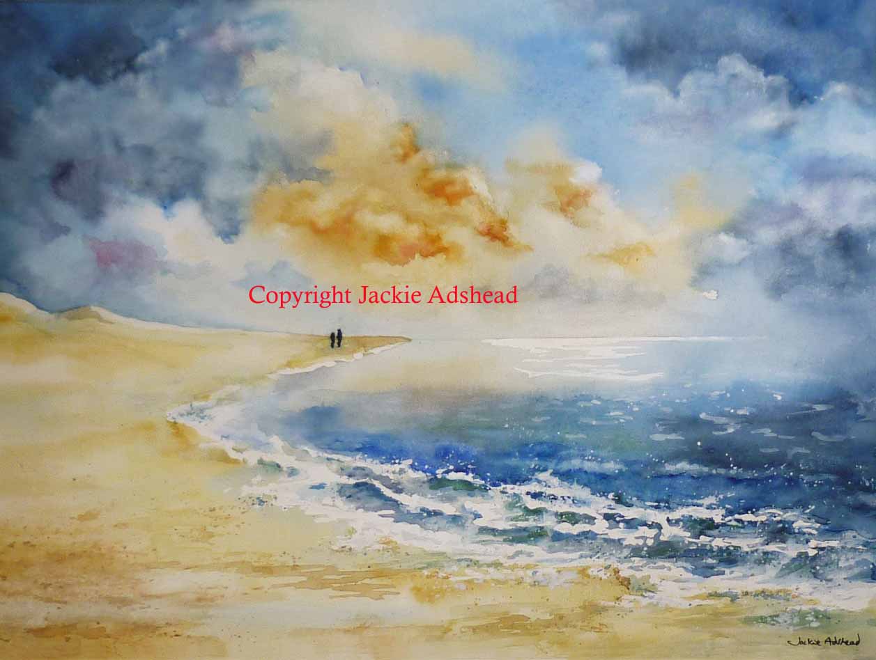 I wanted to show the scene of two people walking on a beach, perhaps collecting shells or just enjoying the companionship of an amble in the sea air. But they were of lesser importance than the landscape and of the weather. I wanted to show the sea and sky almost as one, merging into each other. And I wanted to paint a picture depicting the scudding clouds forming for a storm in the distance, where the sea is starting to raise with the wind, and where the afternoon sun colours the clouds orange and yellow, a beautiful contrast to the blues and greens of the sea.