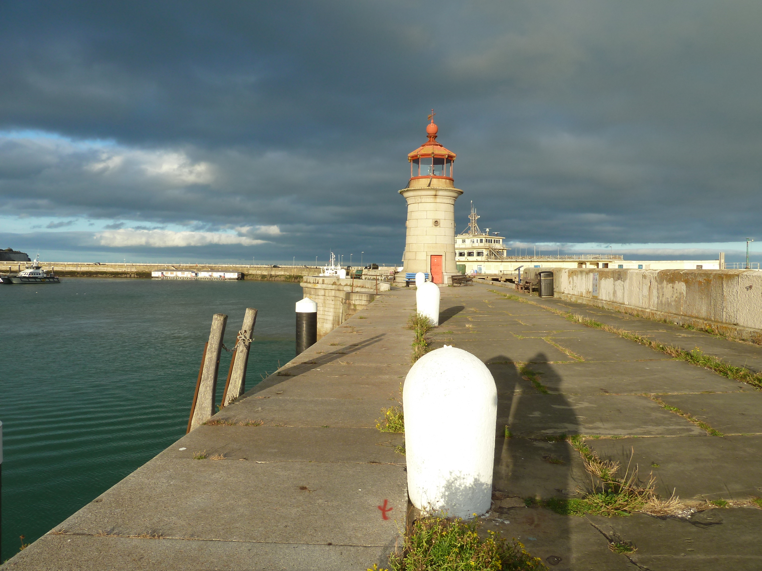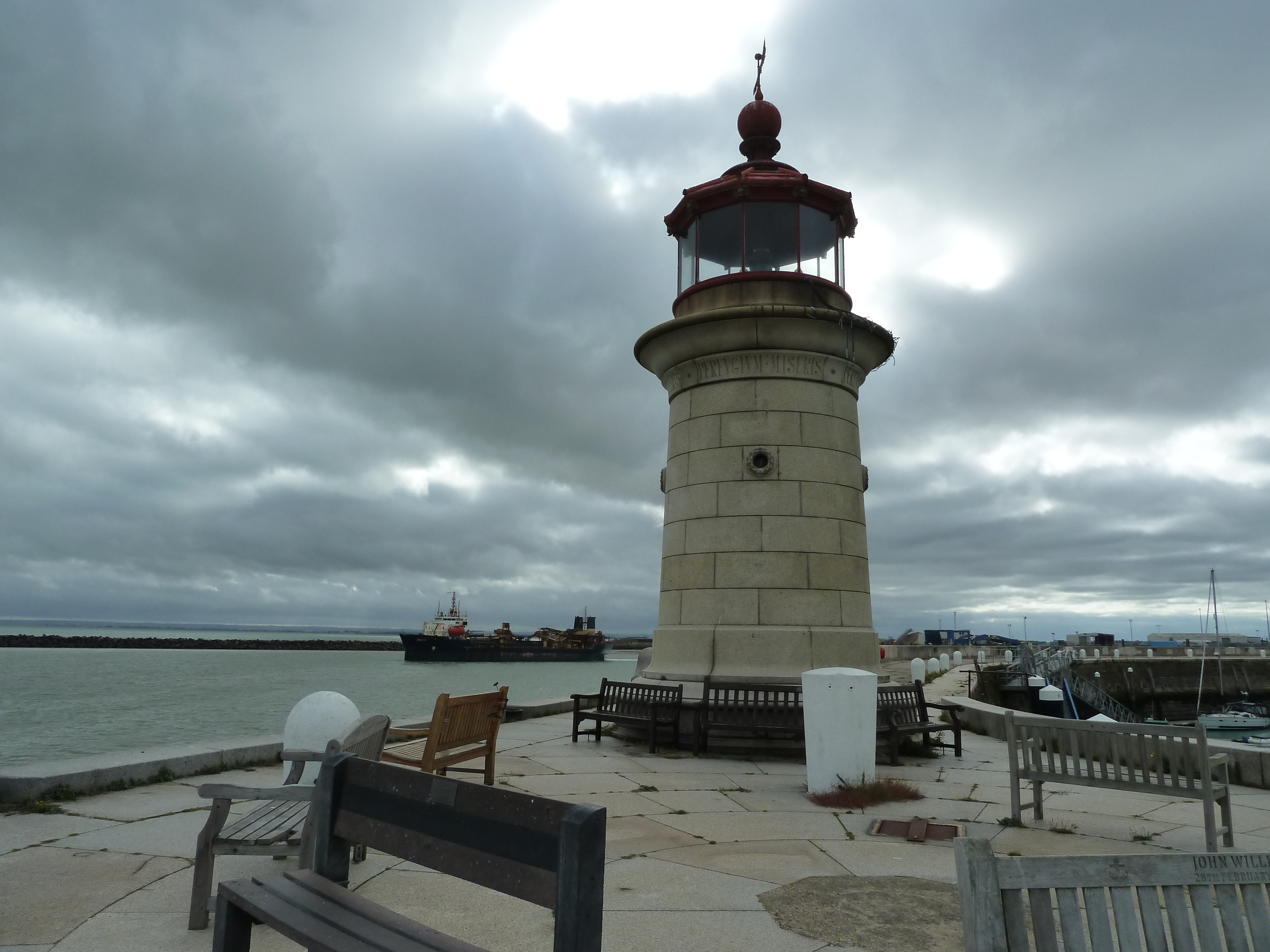 But two hours later when the sun was lower in the sky and the clouds looked heavier with rain it changed the look of the lighthouse was the clouds were darker than the lighthouse stones and the white bollards.