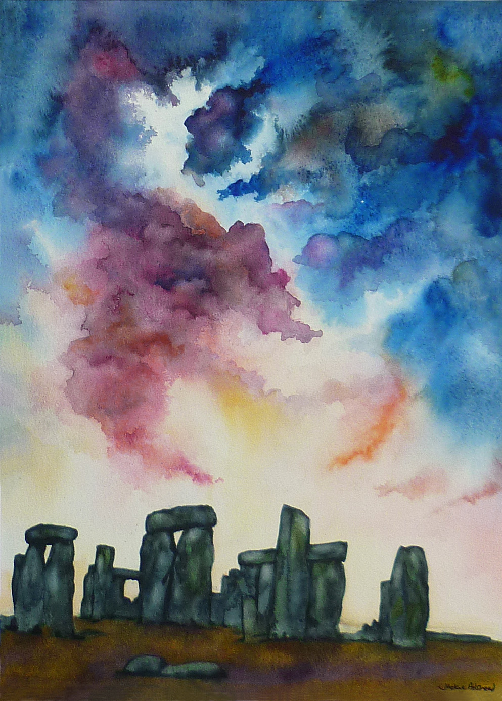 ‘Awakening the unified energies’ in watercolours of Stonehenge and the power of the energies around it..