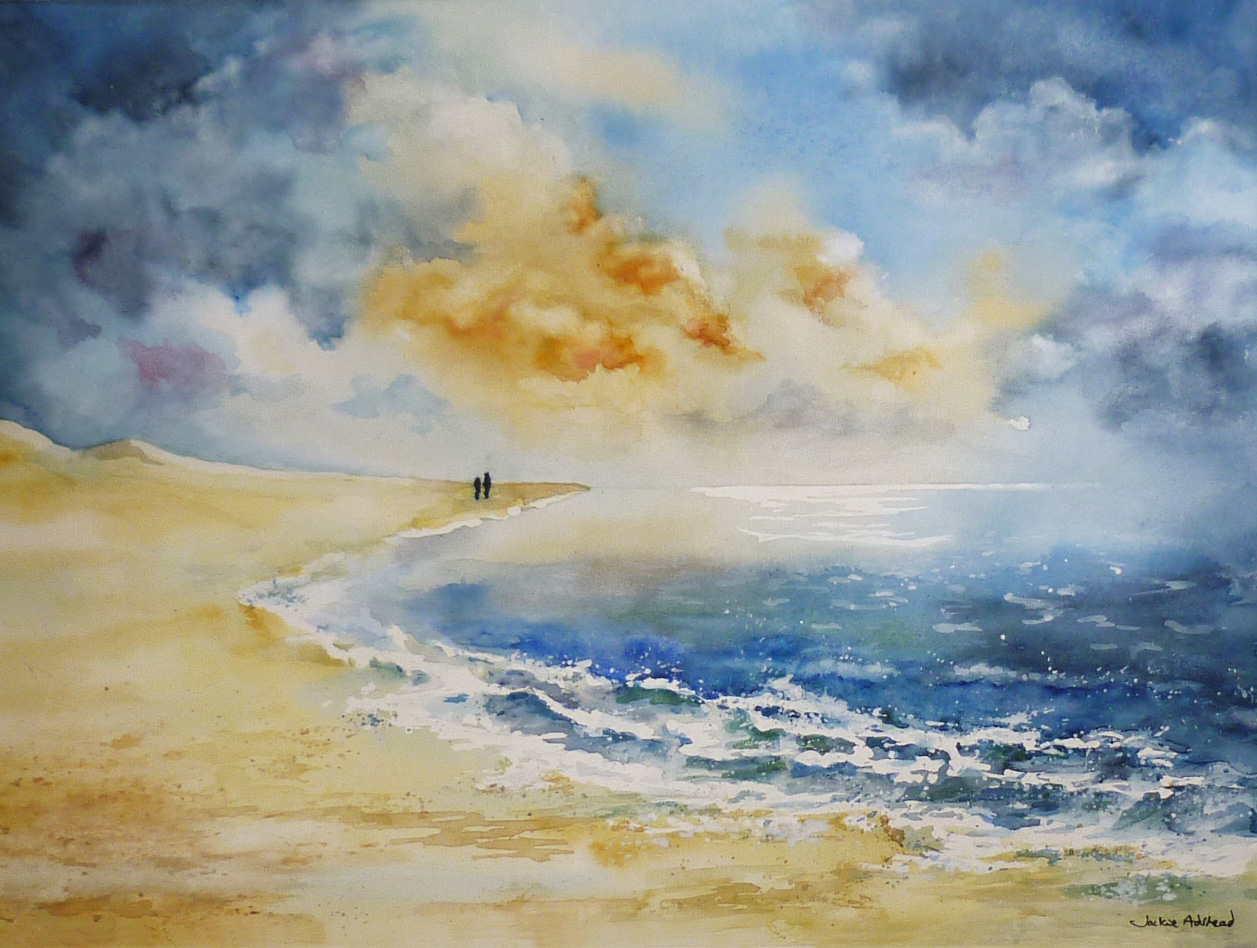 ‘A breath of fresh air’ in watercolours features a couple walking on a beach in the distance with a sky of clouds and the sea crashing in and the sunlight just breaking through to shine on the far horizon.