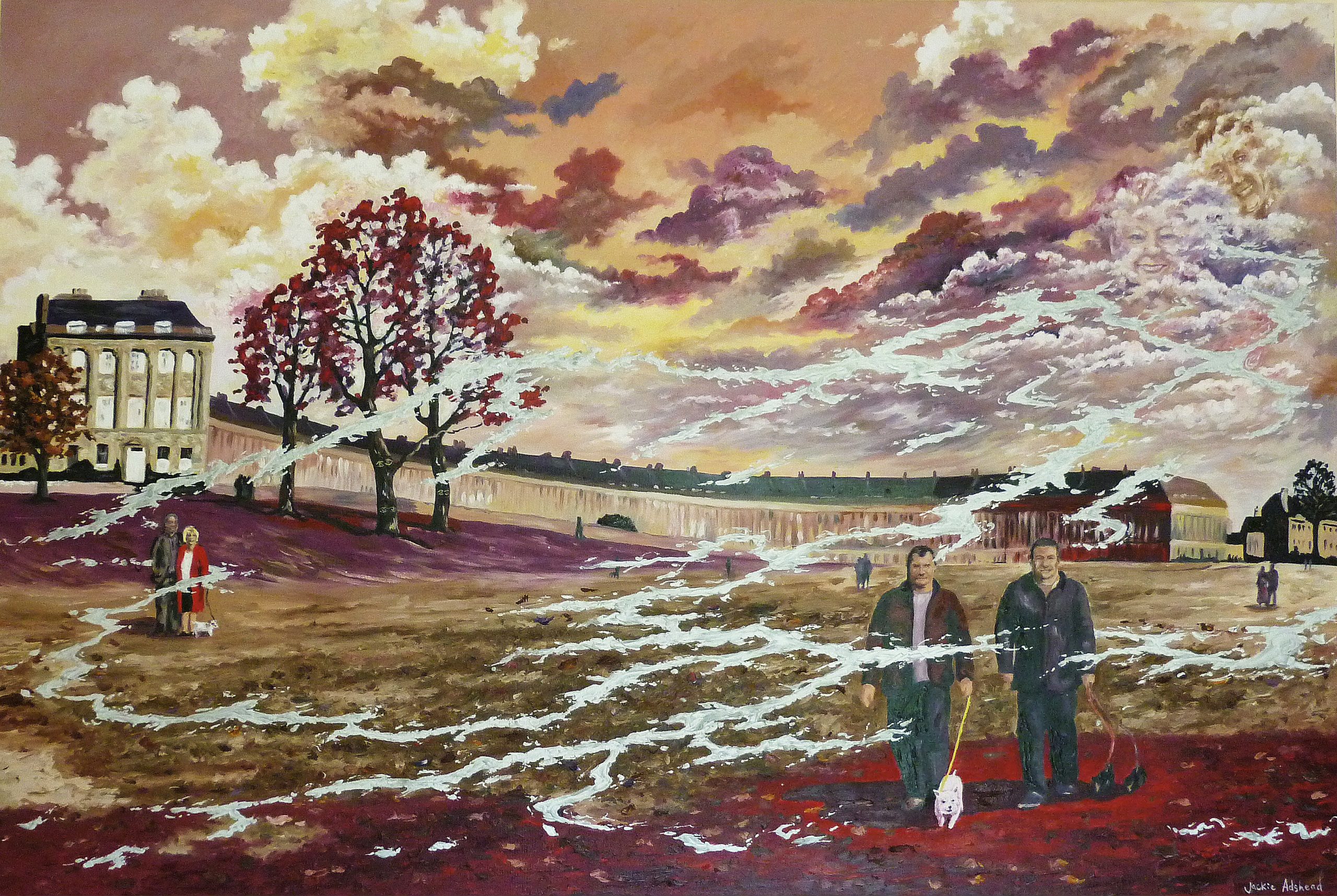 And ‘David and Martyn at the Royal Crescent, Bath – past, present and future’ painted in oils on canvas captures the beloved family and dogs as well as the windy weather of this very atmospheric painting, that I was commissioned to do with the instructions of no blues and no greens in the painting, which was interesting as a third of the painting is sky, and a third is grass! The clients loved this painting when I’d finished it, and I always look at this painting with love and affection…