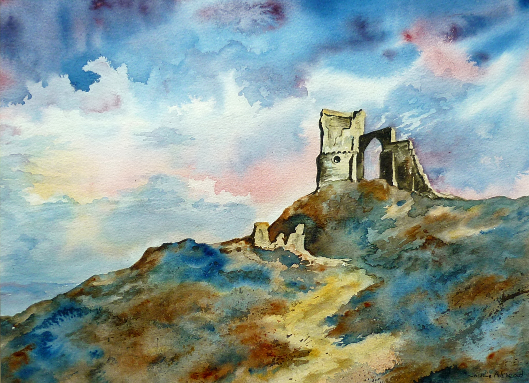 ‘Mow Cop’ in watercolours with the path leading up to the folly overlooking the valley.